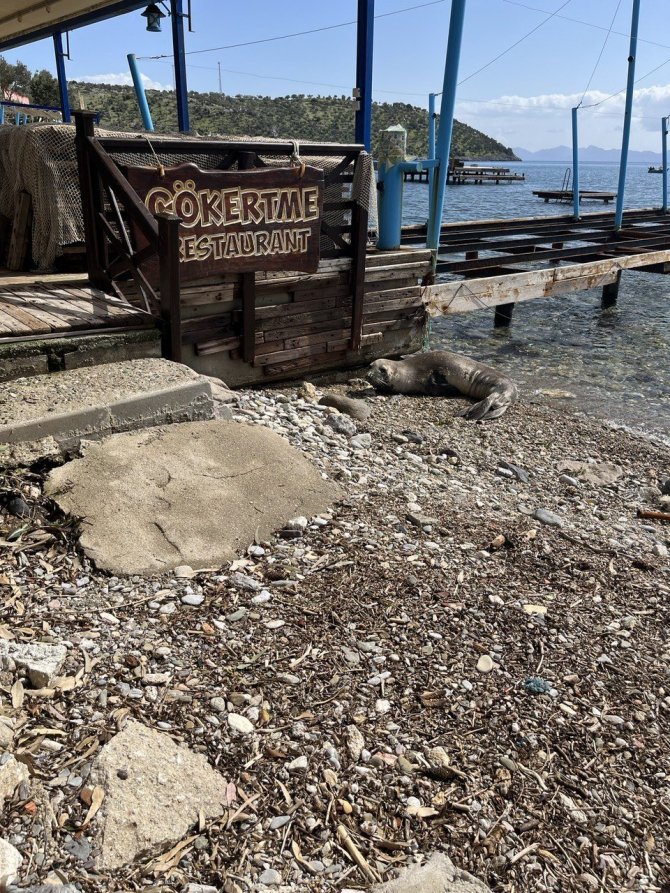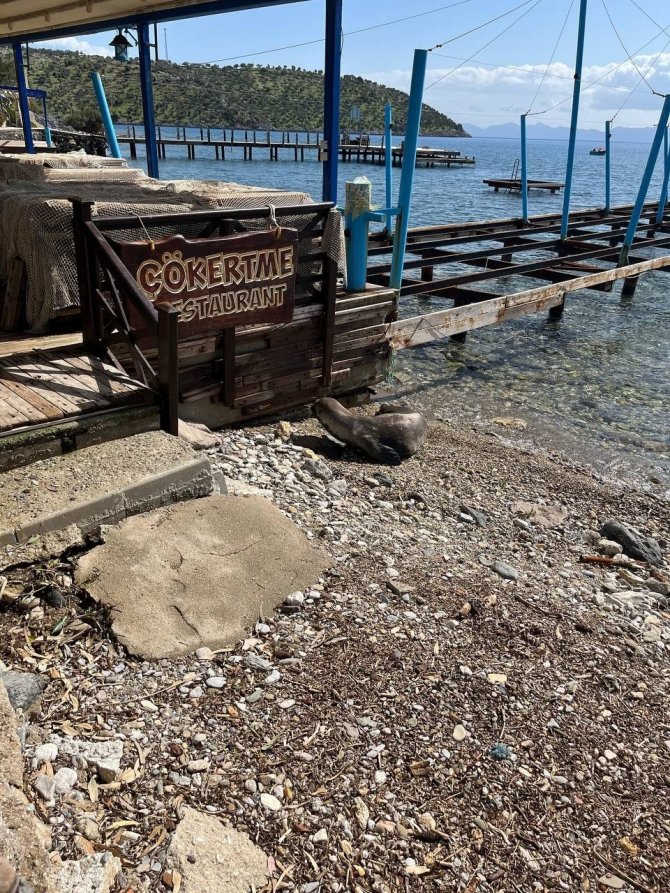 Muğla'nın Milas ilçesinde yetişkin bir fok, geldiği koydan saatlerce ayrılmayıp, kameralara adeta poz verdi.