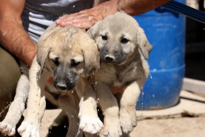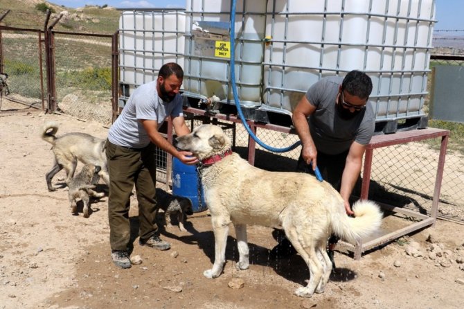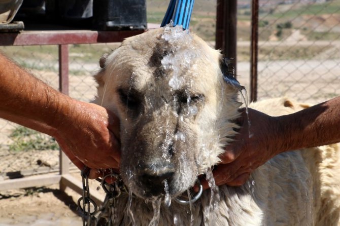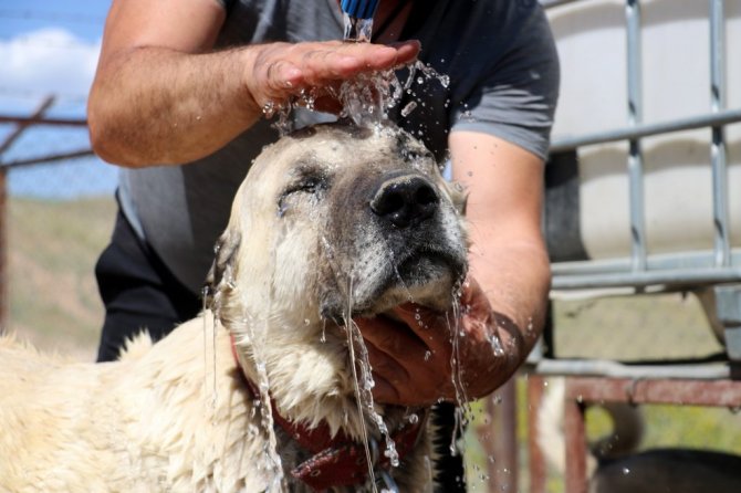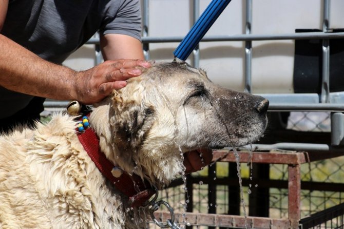 Sivas'ta kangal köpeklerine, kavurucu sıcaklardan etkilenmemeleri için soğuk suyla duş yaptırılıyor.