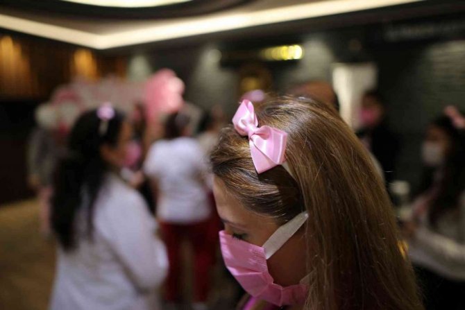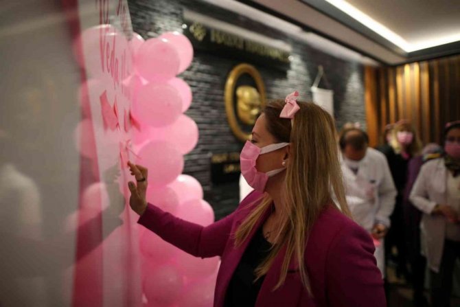 Meme kanserine dikkat çekmek isteyen sağlıkçılar, "veda notu" panosu oluştururken, pembe balonlar da uçurdu.