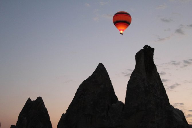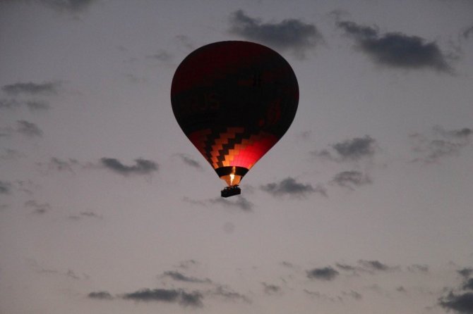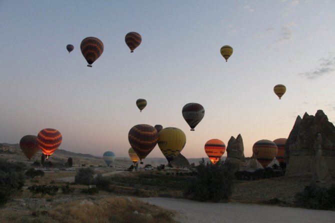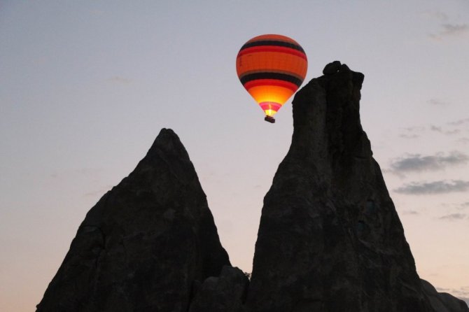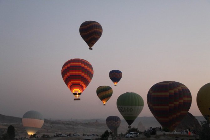 Türkiye'nin önemli turizm merkezlerinden Kapadokya bölgesinde gündoğumu ile birlikte havalanan sıcak hava balonları gökyüzünde adeta dans etti. Kapadokya'da sabahın ilk ışıklarıyla birlikte havalanan sıcak hava balon turlarına yerli ve yabancı turistler büyük ilgi gösterirken sıcak hava balonlarının gökyüzünde görsel şöleni kendisine hayran bıraktı.