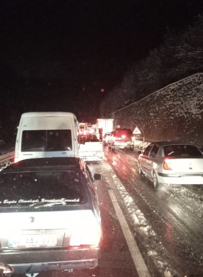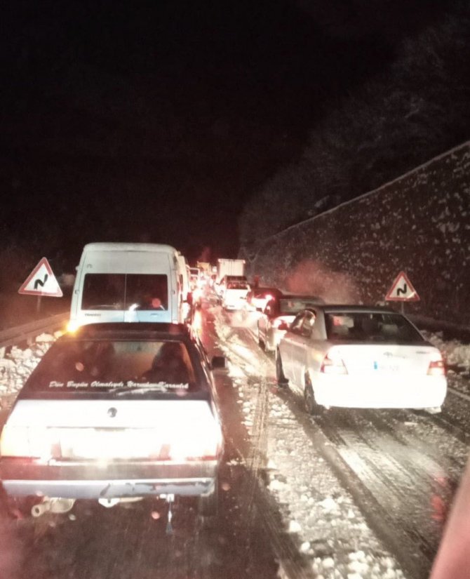Zonguldak Sapça yolunda kar lastiği ve zinciri olmayan tırların yolda kalması sonucu uzun saatlerce trafik oluştu, vatandaşlar mağdur oldu.