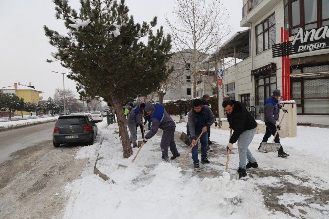 Fen İşleri Müdürlüğü ekipleri karla mücadele çalışmaları için yağış öncesi yaptığı plan dahilinde şehir merkezindeki cadde, sokak ve kaldırımlarda kar temizleme çalışmalarına devam ediyor.