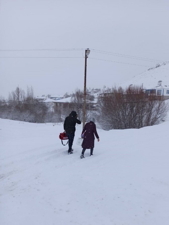 MHRS'den randevu alan 65 yaş ve üstü vatandaşların adreslerine kar yağışı altında giden ekipler zorluklara rağmen korona virüsle mücadelelerini sürdürüyor.