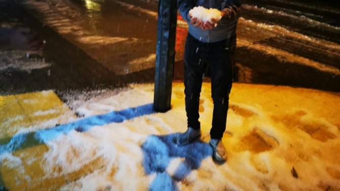 Kar yağışının on yılda bir gerçekleştiği Marmaris'te gece yarısı yağan doluyu kar zanneden vatandaşlar beyaz örtüyü görünce sokağa döküldü.