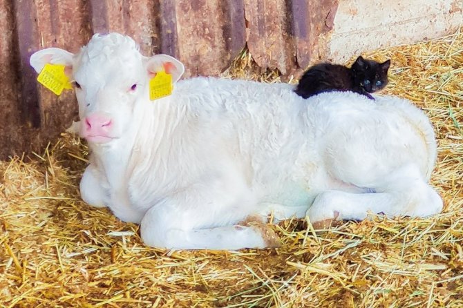 Karacabey'de faaliyet gösteren Aguş Çiftliğinde siyah bir yavru kedi ile beyaz buzağının arkadaşlığı görenleri hayrete düşürüyor. Birbirlerinden hiç ayrılmayan iki sevimli yavru, gece ve gündüz hep yan yana dolaşıyor, birlikte uyuyorlar. Onları gören bakıcıları bu durumu ilk şaşkınlıkla karşıladı.