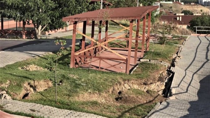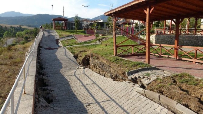 Karabük'te etkili olan sağanak yağışın ardından oyun parkında meydana gelen heyelan sonucu çökme oluştu.