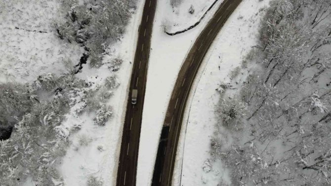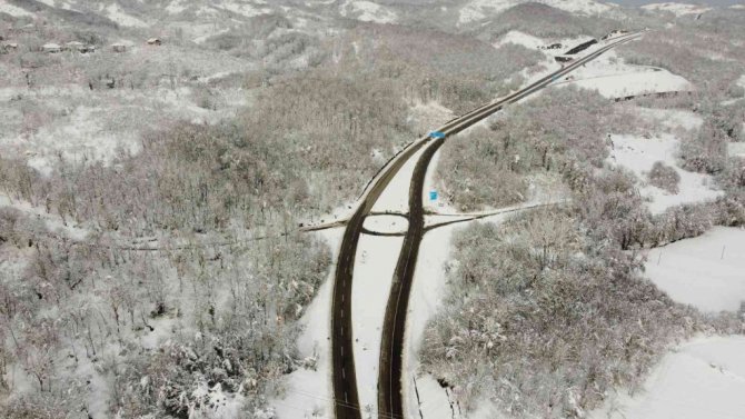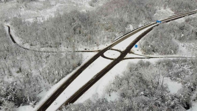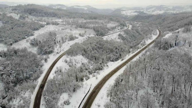 Karadeniz sahil yolunu çevreleyen ormanlarda kar yağışı ile birlikte oluşan manzaralar drone ile görüntülendi.