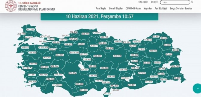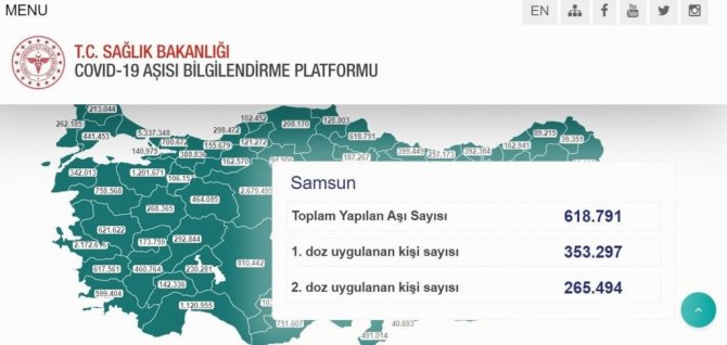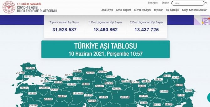 Vaka sayılarının hızla düşmeye başladığı Türkiye'de aşılama faaliyetleri de ara verilmeden devam ediyor. Türkiye genelinde 13 milyon 437 bin 725 kişi iki doz aşısını da olurken, toplam 31 milyon 928 bin 587 doz aşı uygulandı. Karadeniz'de en çok aşı uygulanan il 618 bin 791 doz ile Samsun olurken, en az aşı uygulanan il ise 27 bin 52 doz ile Bayburt oldu.
