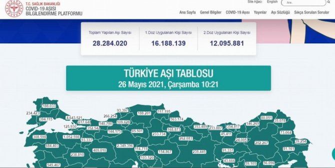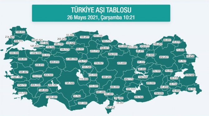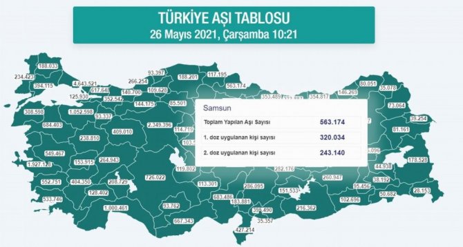 26 Mayıs 2021 itibariyle Türkiye genelinde 16 milyon 188 bin 139 birinci doz, 12 milyon 95 bin 881 ikinci doz olmak üzere toplam 28 milyon 284 bin 20 doz aşı uygulanmış oldu. Türkiye'de yapılan 16 milyon 188 bin 139 birinci doz aşının 1 milyon 978 bin 599'u Karadeniz Bölgesi'nde bulunan 18 ilde uygulandı. Aynı zamanda Türkiye'de yapılan 12 milyon 95 bin 881 ikinci doz aşının 1 milyon 546 bin 744 dozu da Karadeniz'deki illerde uygulandı. Öte yandan Türkiye genelinde uygulanan 28 milyon 284 bin 20 doz aşıdan 3 milyon 525 bin 343 dozu yine Karadeniz'deki illerde uygulandı.
