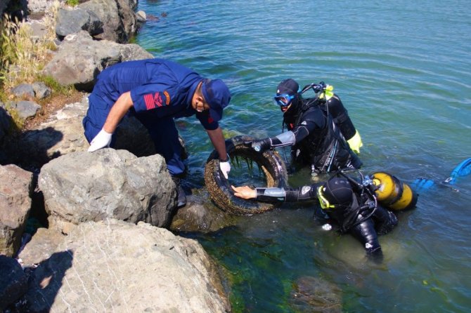 "5 Haziran Dünya Çevre Günü" etkinleri kapsamında Karadeniz'de dalgıçlar tarafından temizlik yapıldı. Sadece 30 dakika yapılan su altı temizliğinde araba tekerleği bile çıkması pes dedirtti.