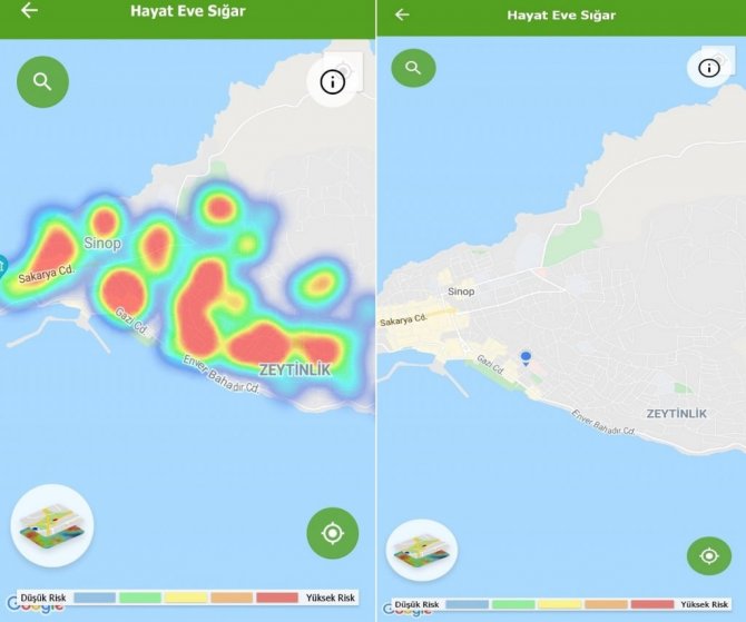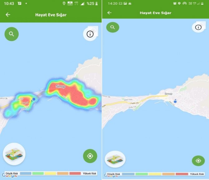 Hayat Eve Sığar uygulamasında şehirdeki kırmızı görünüm yerini renksizliğe bıraktı. Şehrin risksizliği haritaya renksizlik olarak yansıdı. Şehir daha önce çok yüksek riskli iller kategorisinde yer alırken son 2 haftadır turuncu kategoride yer alıyor. Sinop şu anda sarı kategoriye ve maviye de hiç olmadığı kadar yakın.