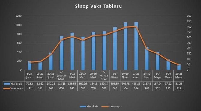 Sinop'ta korona virüsü vakaları düşüşünü sürdürüyor. Kentin, 8-14 Şubat'ta açıklanan ilk tabloda yüz binde 79,52 vaka oranı vardı. 17-23 Nisan'da kent yüz binde 445,35 vaka oranı ile kendi zirvesini gördü. En riskli olduğu bu tarihte şehir kıpkırmızı bir görünümdeydi. Hastane ve yoğun bakım doluluklarının yüksek olduğu belirtilmişti.
