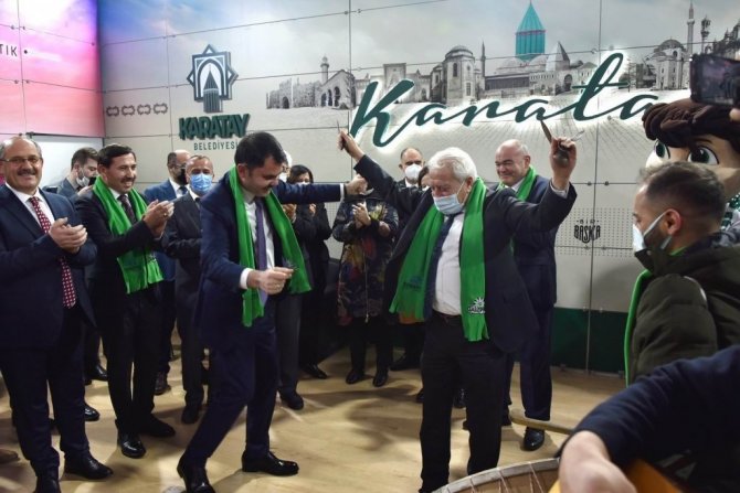 Karatay Belediyesi ve Karatay'daki çalışmalar hakkında bilgi alan protokol üyeleri, bir süre Konyalı Âşıklar Öksüz Ozan ve Yağız Ozan'ı da dinledi. Davulun da çalındığı stantta renkli görüntüler oluşurken; Çevre, Şehircilik ve İklim Değişikliği Bakanı Murat Kurum, Bozkır Belediye Başkanı Sadettin Saygı ile birlikte Konya folklorundan örneklerin sergilendiği kaşık havasına eşlik etti.