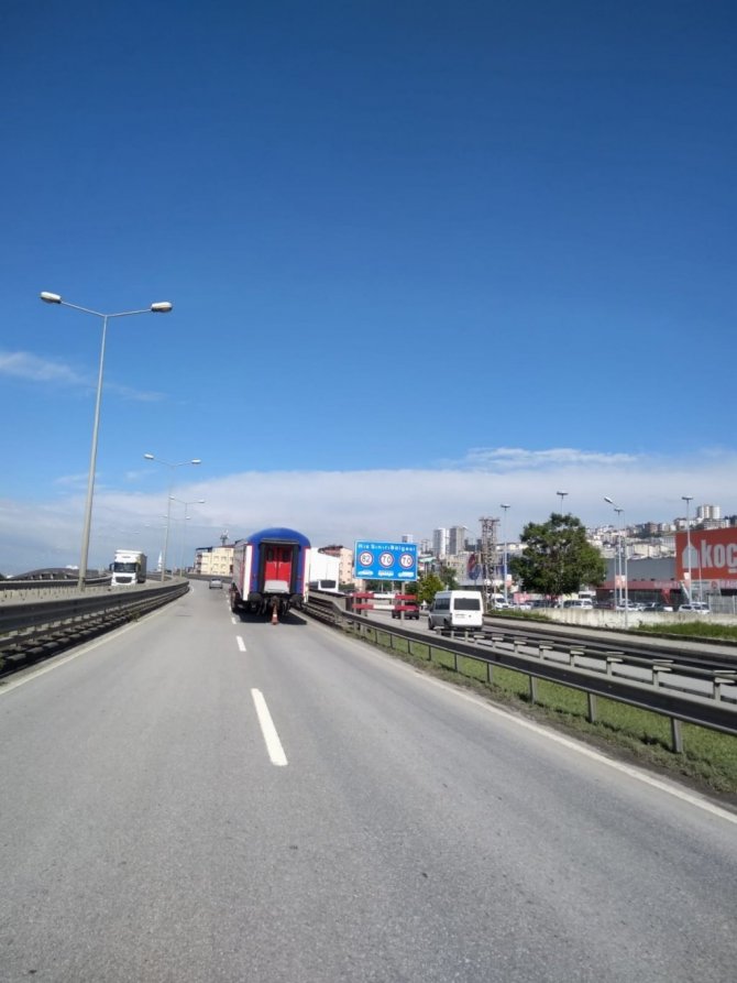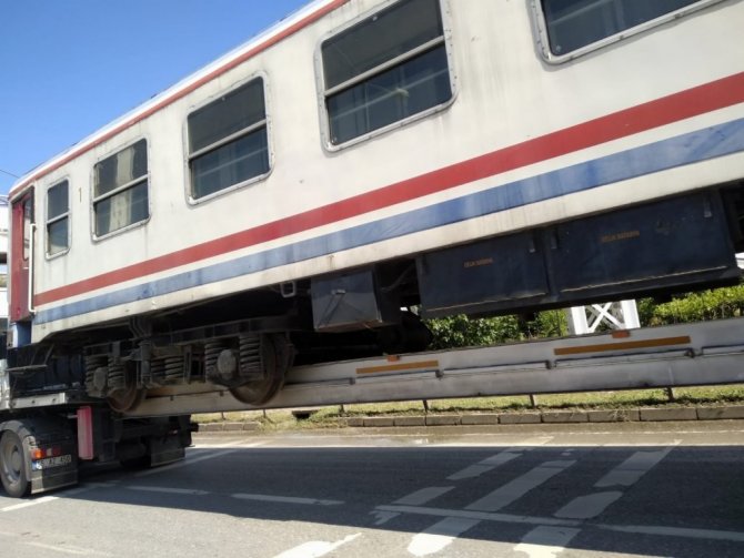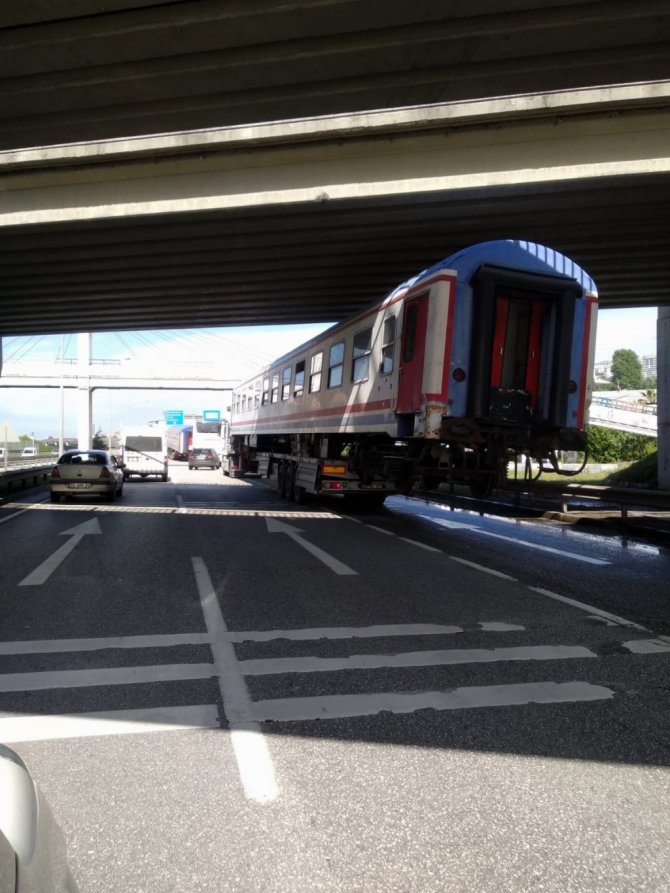 Samsun'da şehirlerarası karayolunda bir tırın dorsesinde taşınan tren vagonu görenlerin dikkatini çekti.