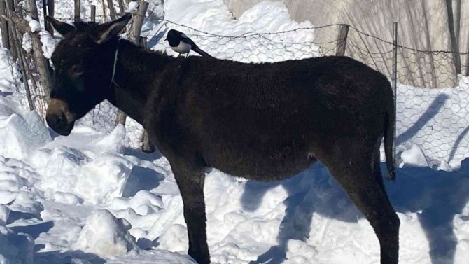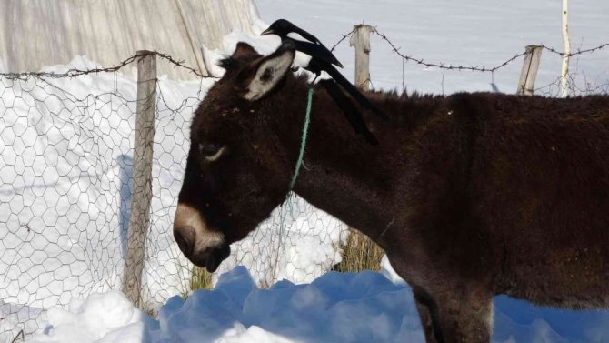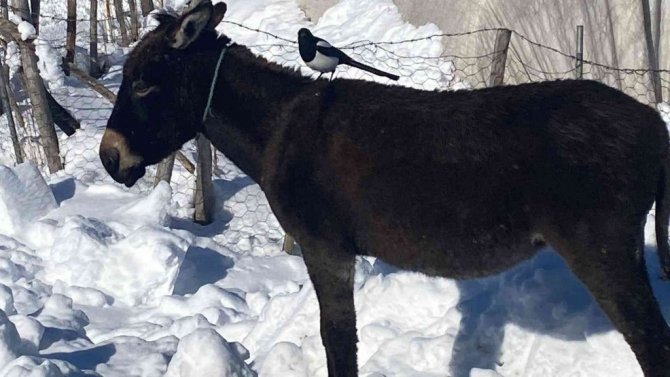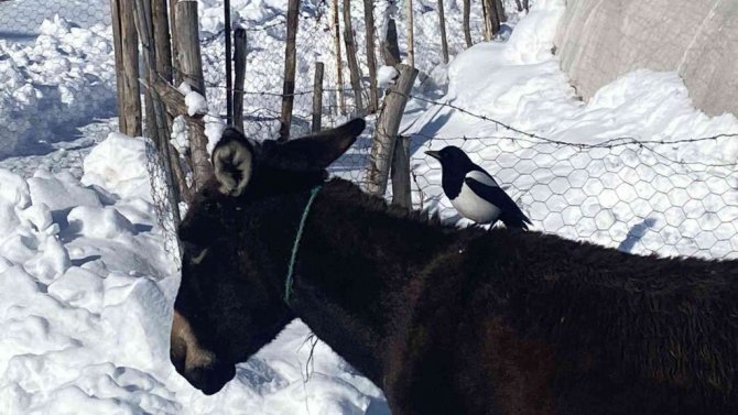 Muş'ta etkili olan yoğun kar yağışı nedeniyle doğada yem bulmakta güçlük çeken saksağanın köydeki eşeklerin başına bela olması, ortaya gülümseten görüntüler çıkardı.