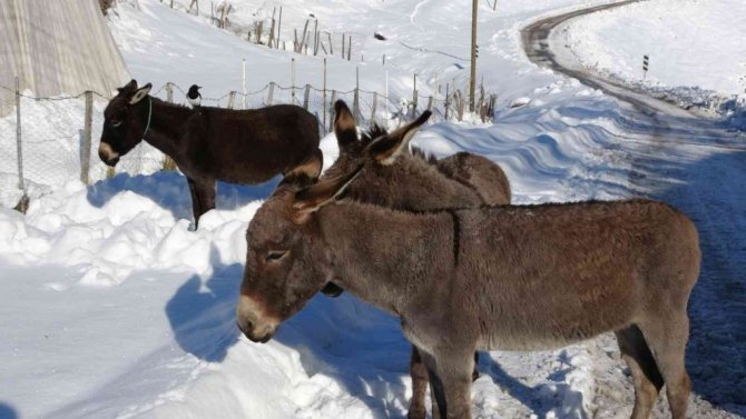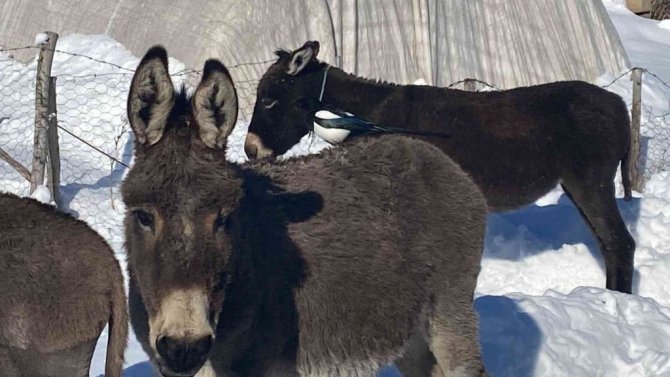 Karda aç kalan saksağan, eşeklerin başına bela oldu