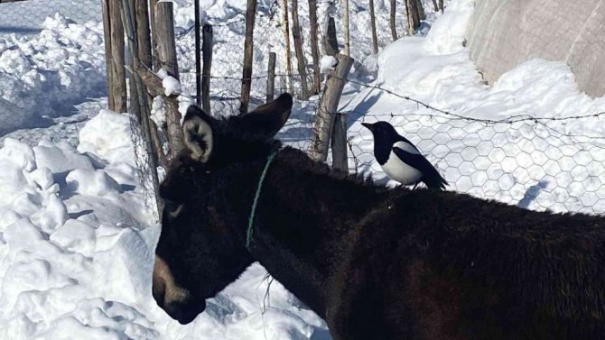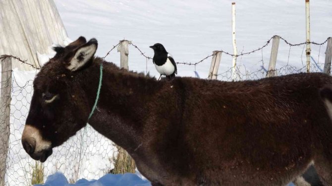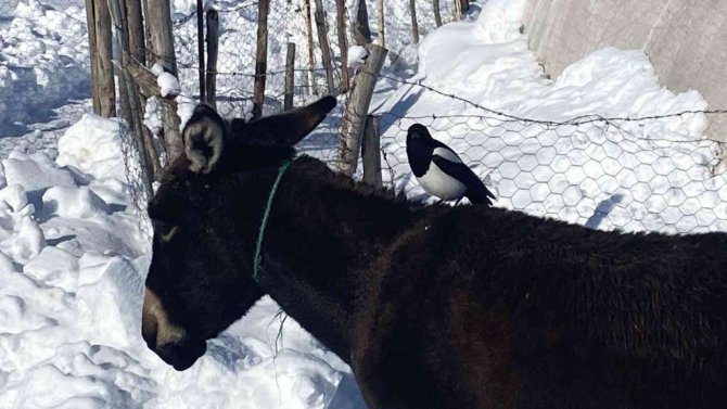 Muş'ta etkili olan yoğun kar yağışı nedeniyle doğada yem bulmakta güçlük çeken saksağanın köydeki eşeklerin başına bela olması, ortaya gülümseten...