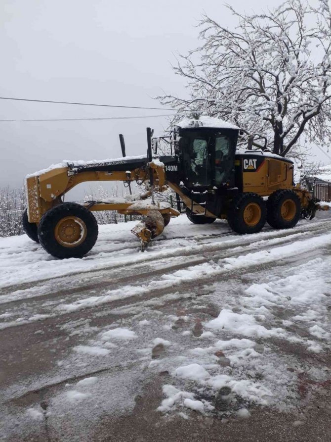 Bursa Osmangazi Belediyesi, kar yağışının başladığı ilçenin yüksek kesimlerindeki mahallelerin yollarının ulaşıma kapanmaması için çalışma başlattı.