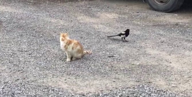 Sivas'ın Ulaş ilçesinden yerde oturan kediyle oyun oynamak isteyen yaramaz karga cep telefonu kamerasına yansıdı.