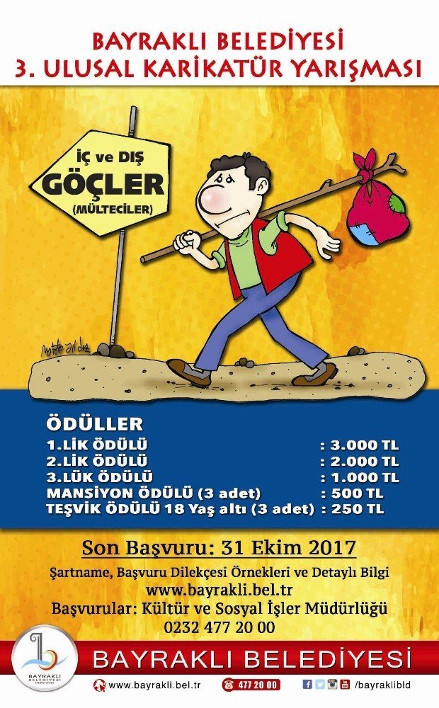 Bayraklı Belediyesi tarafından bu yıl üçüncüsü düzenlenen karikatür yarışmasına başvurular, 31 Ekim’de sona erecek. Konusu “İç ve dış göçler-mülteciler” olarak belirlenen yarışmaya isteyen herkes başv...