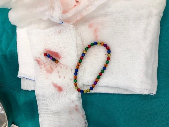 Beylikdüzü’nde 9 yaşındaki bir çocuk ailesinin haberi olmadan neodyum adı verilen stres bilyeleri olarak da bilinen 42 adet mıknatısı yuttu. Birkaç gün sonra şiddetli karın ağrısı ve kusma şikayeti ile hastaneye gelen çocuğun röntgeni çekildi. Röntgen filminde çocuğun midesinde boncuklar halinde yabancı bir cisim tespit edildi. Bağırsağını delen cismi fark eden Beykent Üniversitesi Çocuk Cerrahisi Uzmanı Prof. Dr. Ali Çay çocuğu ameliyata aldı. Yapılan ameliyatta çocuğun bağırsaklarından rengarenk şekilde 42 adet neodyum çıkarıldı.