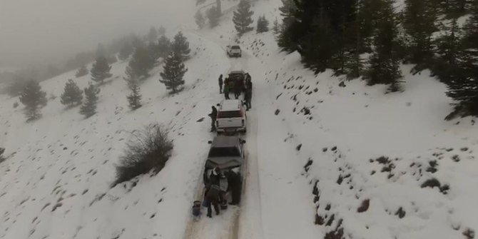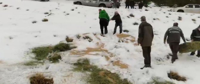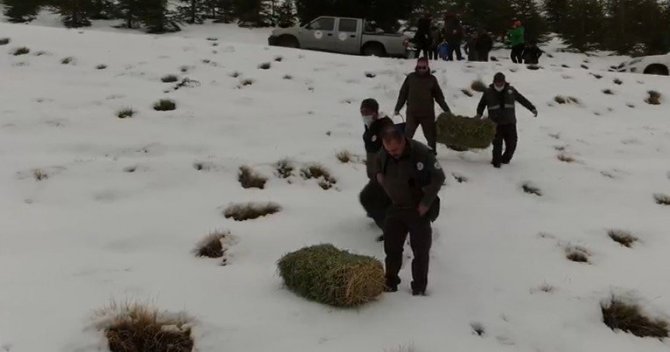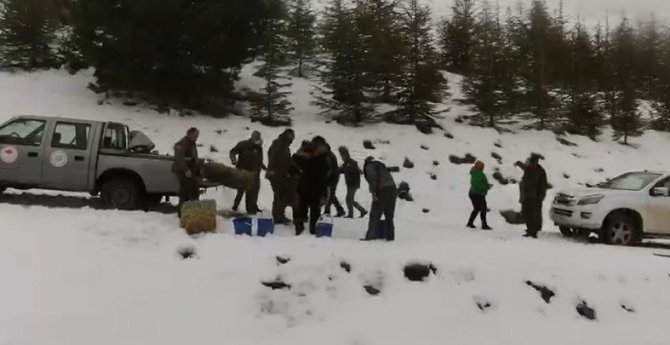 Karlı kaplı dağlara yabani hayvanlar için yem bırakıldı