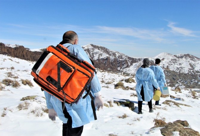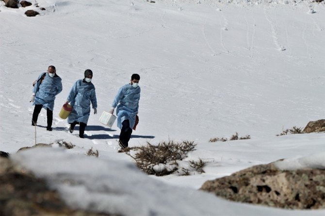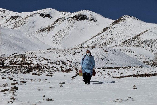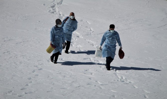 19) ile mücadelede aşı çalışmalarını sürdüren sağlık çalışanları, karlı tepeleri aşarak 90 yaşındaki Paşa dedenin aşışını yaptı.