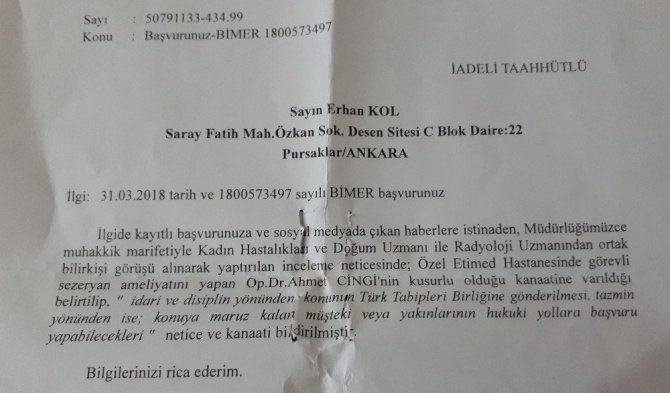 “İlgide kayıtlı başvurunuza ve sosyal medyada çıkan haberlere istinaden, müdürlüğümüzce muhakkik marifetiyle Kadın Hastalıkları ve Doğum Uzmanı ile Radyoloji Uzmanından ortak bilirkişi görüşü alınarak yaptırılan inceleme neticesinde; sezeryan ameliyatını yapan Op. Dr. A.C’nin kusurlu olduğu kanaatine varıldığı belirtilip, ’idari ve disiplin yönünden konunun Türk Tabipler Birliği’ne gönderilmesi, tazmin yönünden ise konuya maruz kalan müşteki veya yakınlarının hukuki yollara başvuru yapabilecekleri’ netice ve kanaati bildirilmiştir. Bilgilerinize rica ederim.”