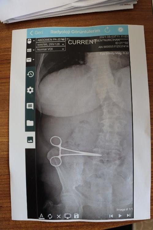 Edinilen bilgiye göre; Kuşadası'nda yaşayan Nurcihan Öğmen (65), 5 Mart 2021'de Kuşadası'ndaki özel bir hastanede mide rahatsızlığı nedeniyle operasyon geçirdi. Hastanede yapılan ameliyattan bir gün sonra taburcu edilen Öğmen'in ağrıları hiç dinmedi. Durumu doktoruna bildiren Öğmen buradan sonuç alamayınca 3 Mayıs 2021'de Söke Devlet Hastanesi'ne müracaat etti. Burada hastaya çekilen röntgeni inceleyen doktorlar gözlerine inanamadı. Hastanın 2 aydır karnında unutulan makas ile yaşadığını fark eden doktorlar Nurcihan Öğmen'i ameliyata alarak kadının karnında unutulan makası çıkardı.