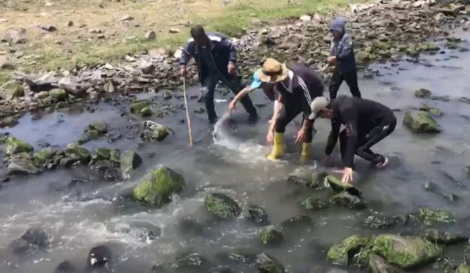 Kars'ta kuraklıktan dolayı dere çekilirken, köylüler balık tutmak için adeta dereye koştu.