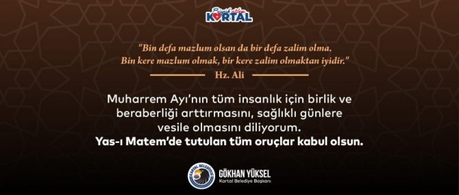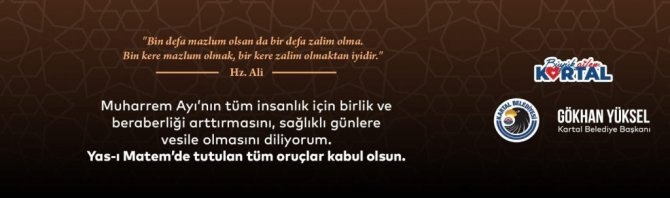Kartal Belediye Başkanı Gökhan Yüksel, 20 Ağustos Hicri Yılbaşı, Muharrem Ayı ve orucunun başlaması nedeniyle bir mesaj yayımladı. Başkan Gökhan Yüksel, Muharrem Ayı nedeniyle yayımladığı mesajında "Paylaşmanın, bir arada olmanın, bereketin adı olan Aşure gününü de barındıran Muharrem ayında yasımızı ve lokmamızı paylaşıyoruz." ifadelerini kullandı.