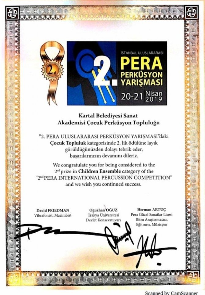 6-15 yaş arası Kartallı çocukların eğitim gördüğü akademinin “Perküsyon” grubu, geçtiğimiz yıl aldığı dünya birinciliğinin ardından bu yıl da aynı yarışmadan ikincilik derecesi aldı. Geçen yıl düzenlenen Uluslararası Pera Perküsyon Yarışmasında Derya Şah Özkan yönetimindeki 19 çocuktan oluşan grup ile birinci olan Sanat Akademisi Perküsyon Grubu, bu yıl düzenlenen yarışmada Danışman Öğrt. Gör. Engin Gürkey yönetiminde dünya ikincisi oldu. Dünyaca ünlü Amerikalı perküsyonist David Friedman ile masterclass eğitimlerini başarıyla tamamlayan öğrenciler, Kartal Belediyesi Sanat Akademisi’ni en iyi şekilde temsil ettiler.