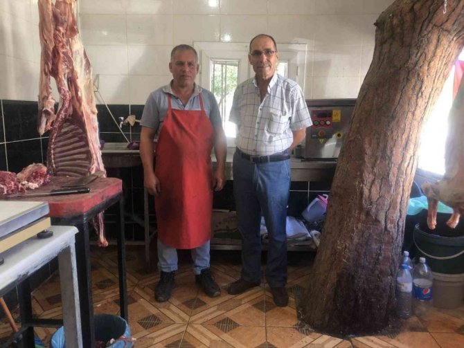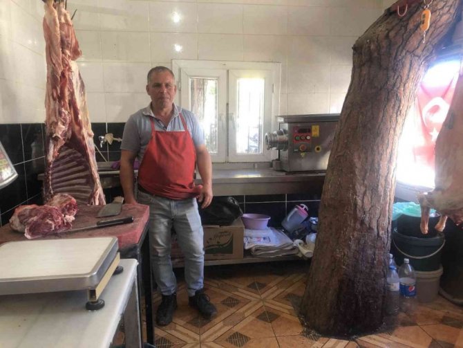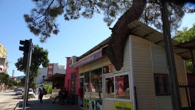 Adana'nın Kozan ilçesinde 32 yıldır kasaplık yapan Ali Ölmez'in, iş yerinin ortasındaki asırlık çam ağacı görenleri şaşırtıyor.