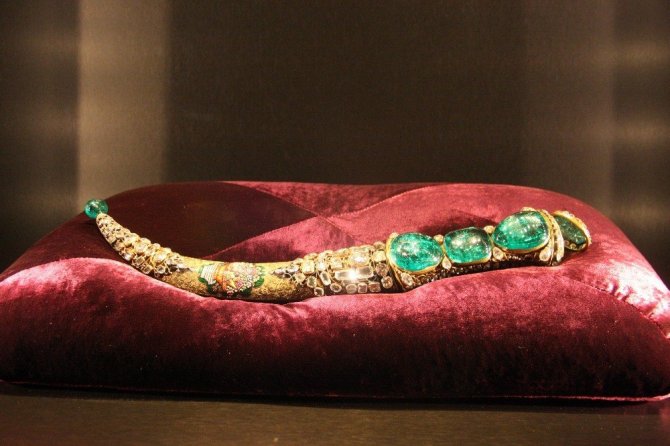 Sultan I. Mahmud’un Nadir Şah’a hediye edilmek üzere yaptırdığı ancak Şah’ın ölümü üzerine Topkapı Sarayı hazinesinde muhafaza altına alınan zümrüt ve elmas taşlarla süslü Topkapı Hançeri, dünyanın sayılı hazineleri arasında gösteriliyor. Topkapı Hançeri, Osmanlı döneminde yaşayan mücevher ustalarının ne kadar maharetli olduğunu gösteren inceliklerle bezeli. ‘Dünyanın en değerli hançeri’ olarak gösterilen hançer, kabzasıyla da benzersiz. Kabza üzerinde 3-4 milimetrelik üç zümrüt taş ve yine kabzanın en üst kısmındaki kapak üzerinde tek parça bir zümrüt taş yer almakta. Kapaktaki zümrüt etrafında kesilmiş mücevherler, içinde ise Londra’da üretilmiş bir saatin bulunduğu hançerin kını altın sırlar ve sepet içinde stilize hafif kabartma meyve mineleriyle süslü.
