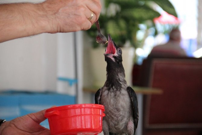 Kaşıkla yemek verilen, enjektörle su içirilen yavru karga, kafede masalara da misafir oluyor