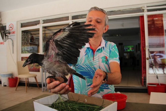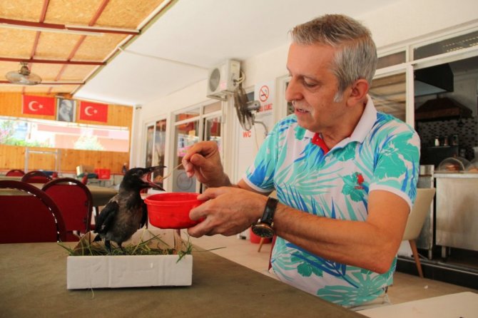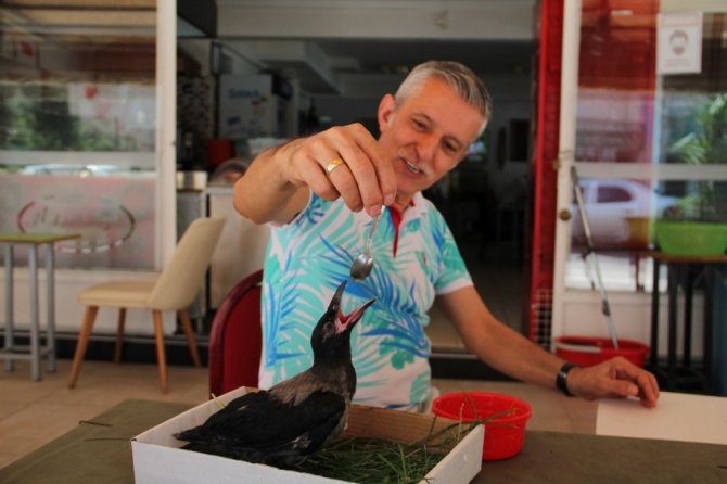Antalya'da esnaflık yapan Mehmet Sırtıkara, yuvasından düşen bir karga yavrusunu iş yerinde bebek gibi besliyor.