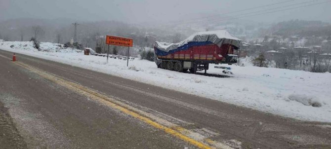 Kastamonu'nun Cide ilçesinde, sahil bölgesinde fırtına etkili olurken, iç kesimlerde de kar yağışı başladı. Kar yağışı ile birlikte Cide-Bartın karayolunda ulaşımda aksamalar yaşandı.