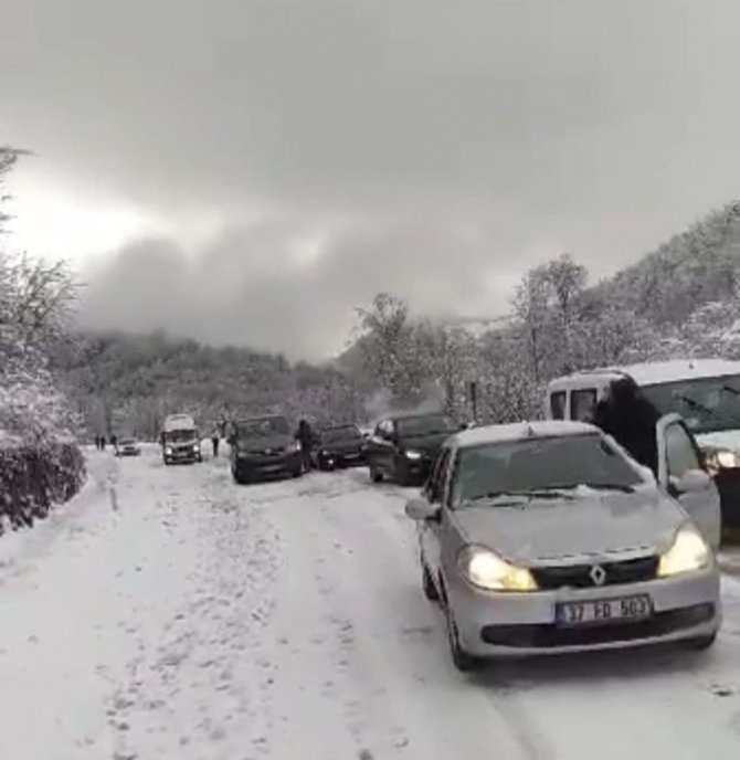 Kastamonu'nun sahil bölgesinde fırtına ve kar yağışı etkili olmaya devam ediyor. Özellikle Cide'de sahil bölgesinde şiddetli fırtına hayatı olumsuz etkilerken, ilçenin yüksek kesimlerinde ise kar yağışı etkili oluyor. Kısa sürede yağan kar yağışı nedeniyle yollar beyaz örtüyle kaplanırken, Cide-Bartın karayolunda ise ulaşımda aksamalar yaşanıyor. Cide-Bartın karayolu Amasra bölgesinde özellikle şiddetli kar yağışı nedeniyle araçlar ilerlemekte güçlük çekerken, bazı sürücüler ise çareyi araçlarına zincir takmakta buldu.
