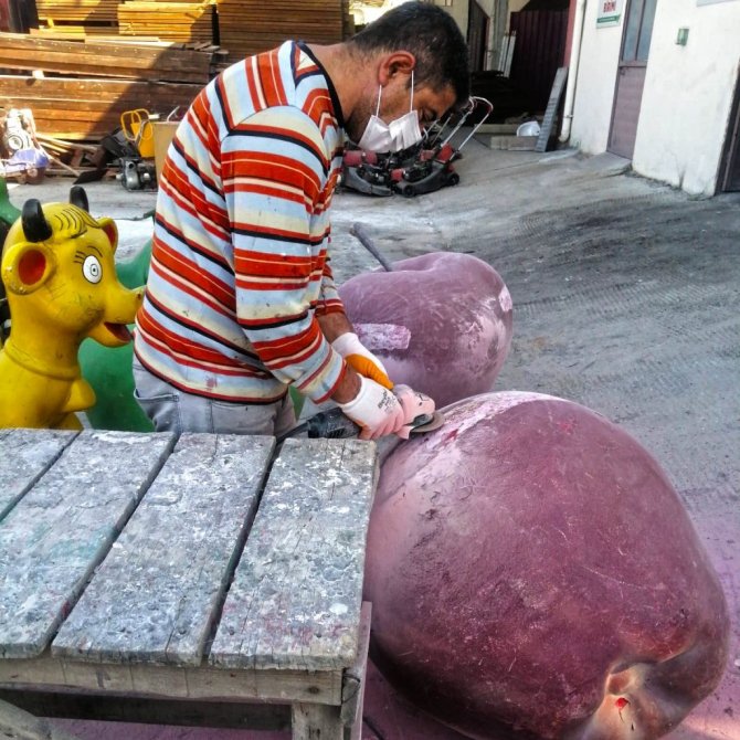 Kahramanmaraş'ta atölyelerde usta eller tarafından imal edilen elmalar, Göksun ilçesindeki kavşakları süslüyor.