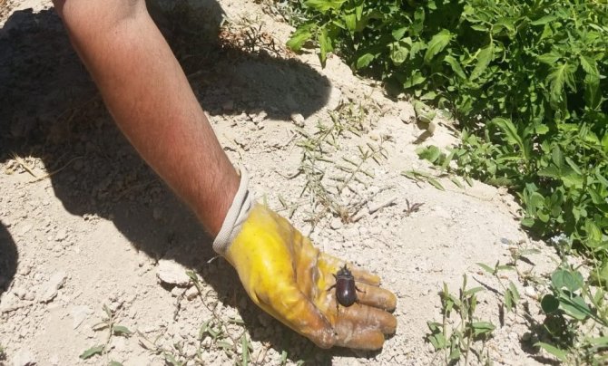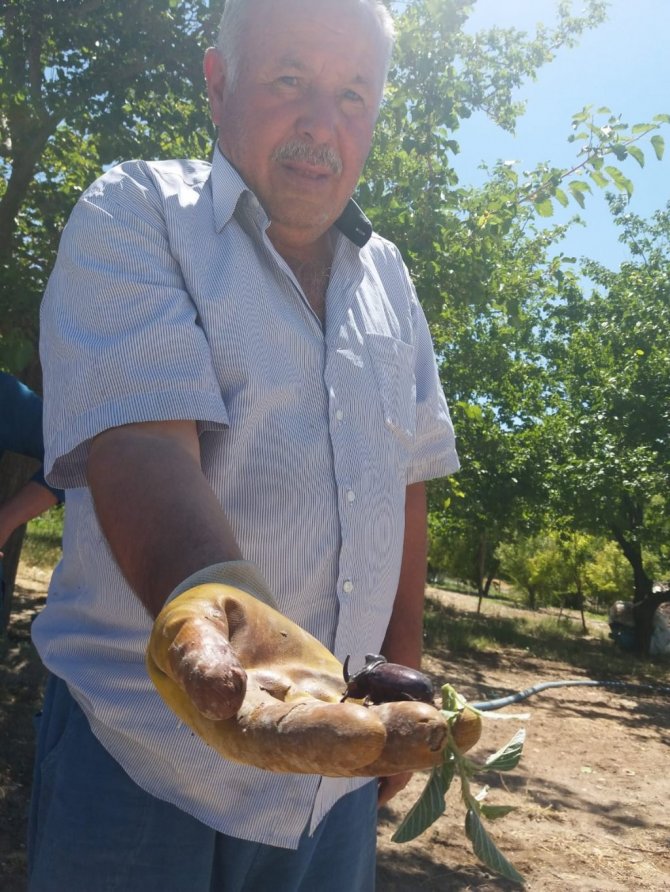 Kahramanmaraş'ın Elbistan ilçesinde Ramazan Öğüt adlı vatandaş, kayısı bahçesinde dünyanın en güçlü böceği olarak bilinen "gergedan böceği" buldu.