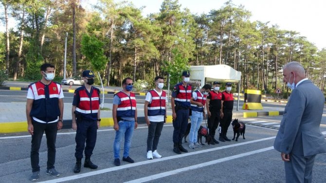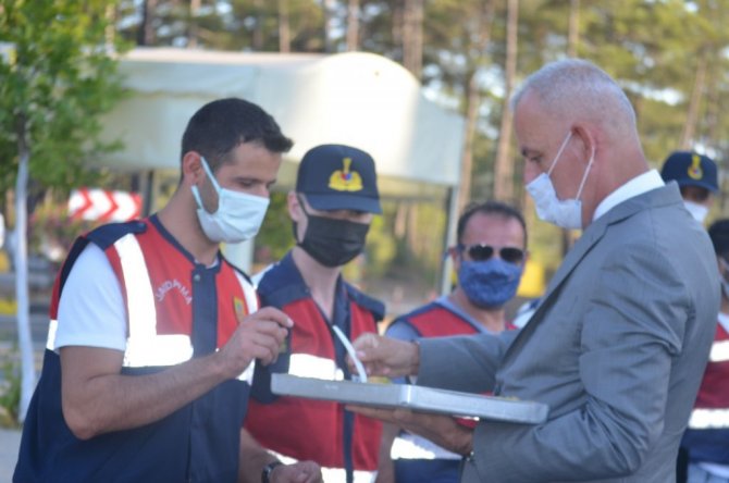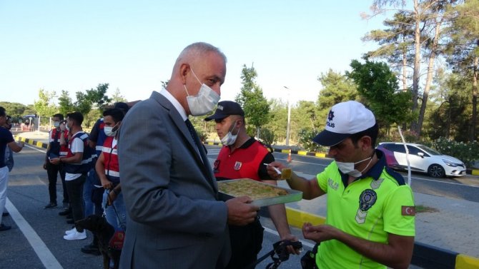 Marmaris-Muğla Karayolu'nun 21'inci kilometresinde bulunan kontrol noktasını ziyaret eden Marmaris Kaymakamı Ertuğ Şevket Aksoy, jandarma ekiplerini denetleyerek baklava ikram etti.