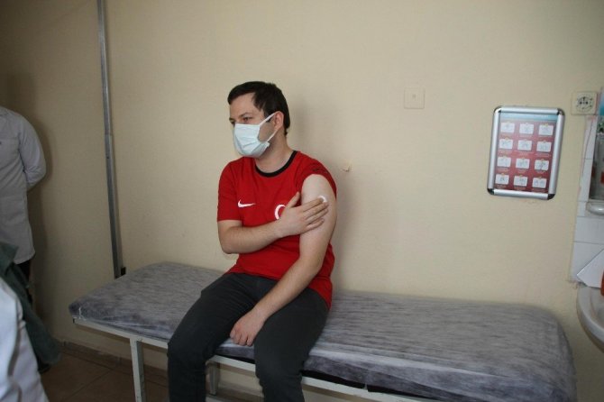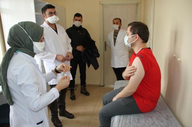 Kaymakam Yiğit Yaşar Demirer'e korona virüs ilk doz aşısı, Malazgirt 1 Nolu Sağlık Ocağında Hemşire Bahar Pirinci tarafından vuruldu.