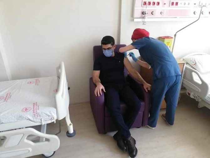 Malatya'nın Arguvan ilçesi Kaymakamı Gökhan Dolaş, İlçe Toplum Sağlığı Merkezi'nde korona virüs aşısı oldu.