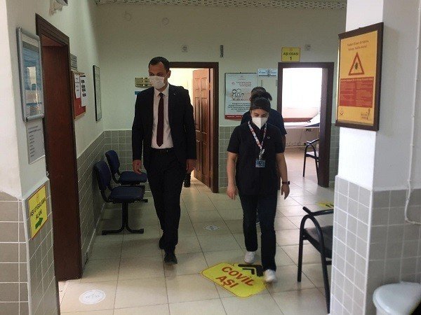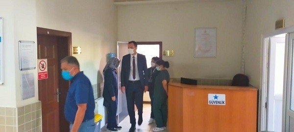 Kaymakam Mehmet Faruk Kazdal, Şehit Eyüp Hacıoğlu İlçe Devlet Hastanesi'ni ziyaret etti. Yapılan çalışmalar hakkında Başhekim Nur Kaplan Demir'den bilgi alan Kaymakam Kazdal, Covid-19 önlemleri ve çalışmaları hakkında bilgi aldı.