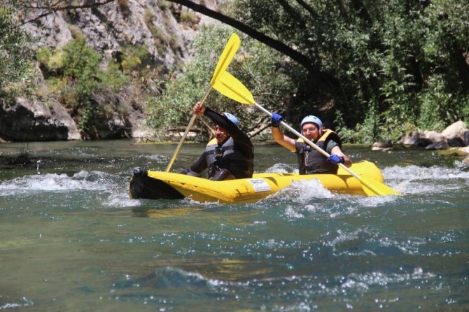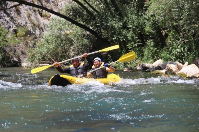 SİVAS (İHA) – Sivas'ta Gürün İlçe Kaymakamı Ahmet Tan ve doğa sporcusu Erol Bozkuş, Terelik kanyonunda rafting ve kano yapılacağını ispatlamak için kendilerini Tohma çayının azgın sularına bıraktı.