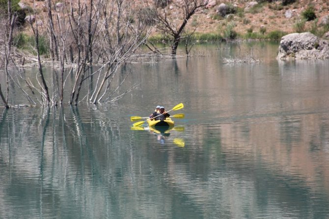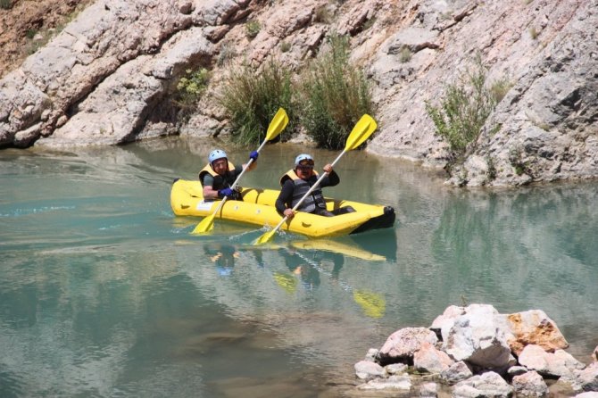 SİVAS (İHA) – Sivas'ta Gürün İlçe Kaymakamı Ahmet Tan ve doğa sporcusu Erol Bozkuş, Terelik kanyonunda rafting ve kano yapılacağını ispatlamak için...