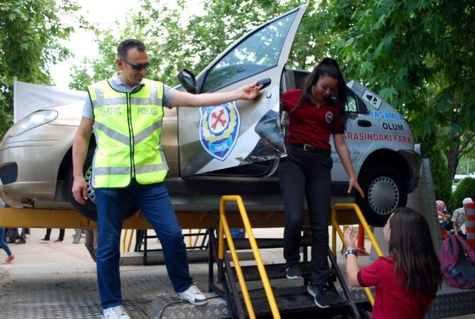 Manisa’nın Salihli ilçesinde emniyet kemeri kullanımına dikkat çekmek ve trafikteki önemine vurgu yapmak amacıyla simülasyon aracına binen öğrenciler kaza anında aracın takla atma anını, hem emniyet kemeri takılı, hem de emniyet kemeri takılı olmadan yaşadı.
