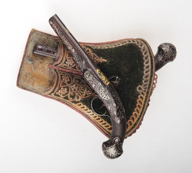 Müzayede’nin dikkat çekici bir diğer eseri ise 3. Selim dönemine ait saray işi bir çift Piştov olacak. Kökeninin İspanyollar’a dayandığı bilinen ve “Tabancaların atası” olarak da adlandırılan Piştov’lar özel kılıfları içinde ve son derece iyi korunmuş durumda. Üzerinde Osmanlı arması bulunan silahlar altın ve gümüş kakmalarla bezeli. Gümüş işlemeli kılıfı içinde satışa sunulacak bir çift Piştov’un müzayede çıkış fiyatı ise 45 bin lira olacak. Piştov’ların özellikle koleksiyonerlerin büyük ilgisini çekeceği belirtiliyor.