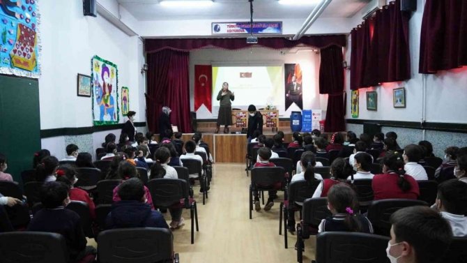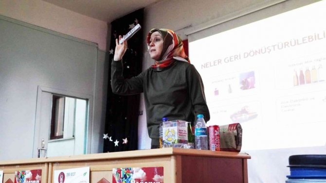 Keçiören Belediyesi tarafından ilçedeki Mecidiye İlkokulu'nda gerçekleştirilen çevre ve geri dönüşüm konulu eğitim toplantısında, atıkların nasıl...