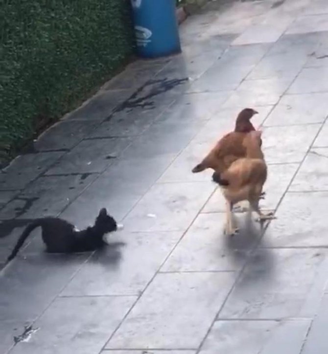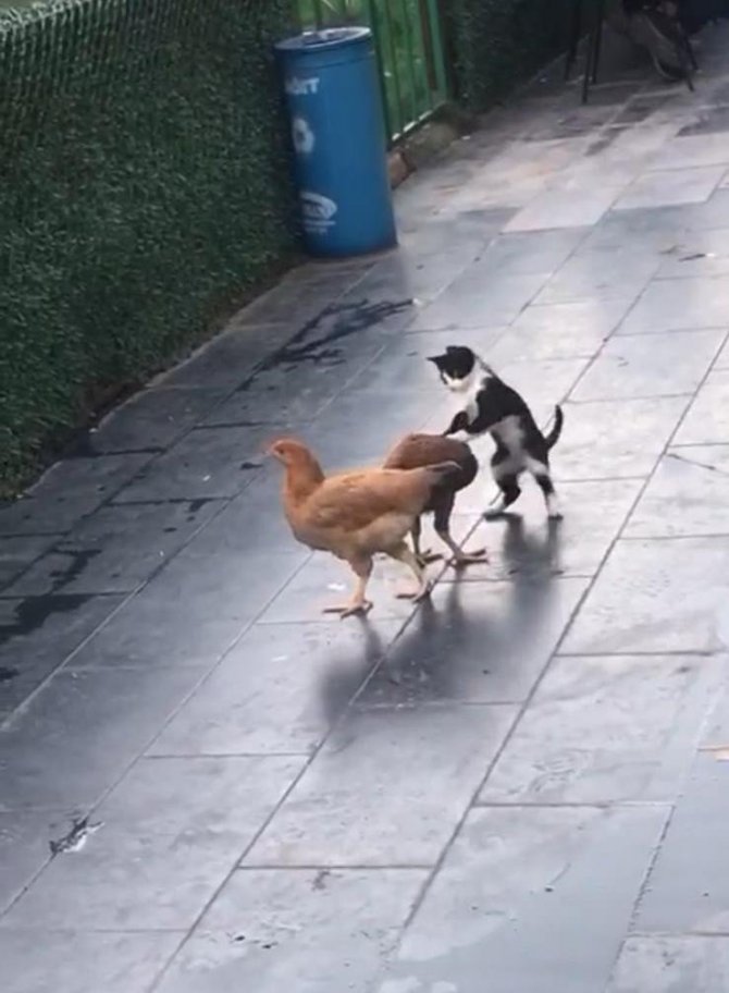 AK Parti Diyarbakır İl Başkanlığı bahçesinde hayvanlar için ayrılan yaşam alanında bir kedi ve iki tavuğun dostane oyunu görenleri gülümsetti. Kedinin can sıkıntısından tavukların boynuna atlayarak sarılmaya çalışması çevredekilerin cep telefonu kameralarına yansıdı. Görüntülerde iki tavuğun yanına gelen kedi, ön ayakları ile tavuklara sarılarak bir süre oynadıktan sonra yere yatıp değişik oyunlar oynadı.